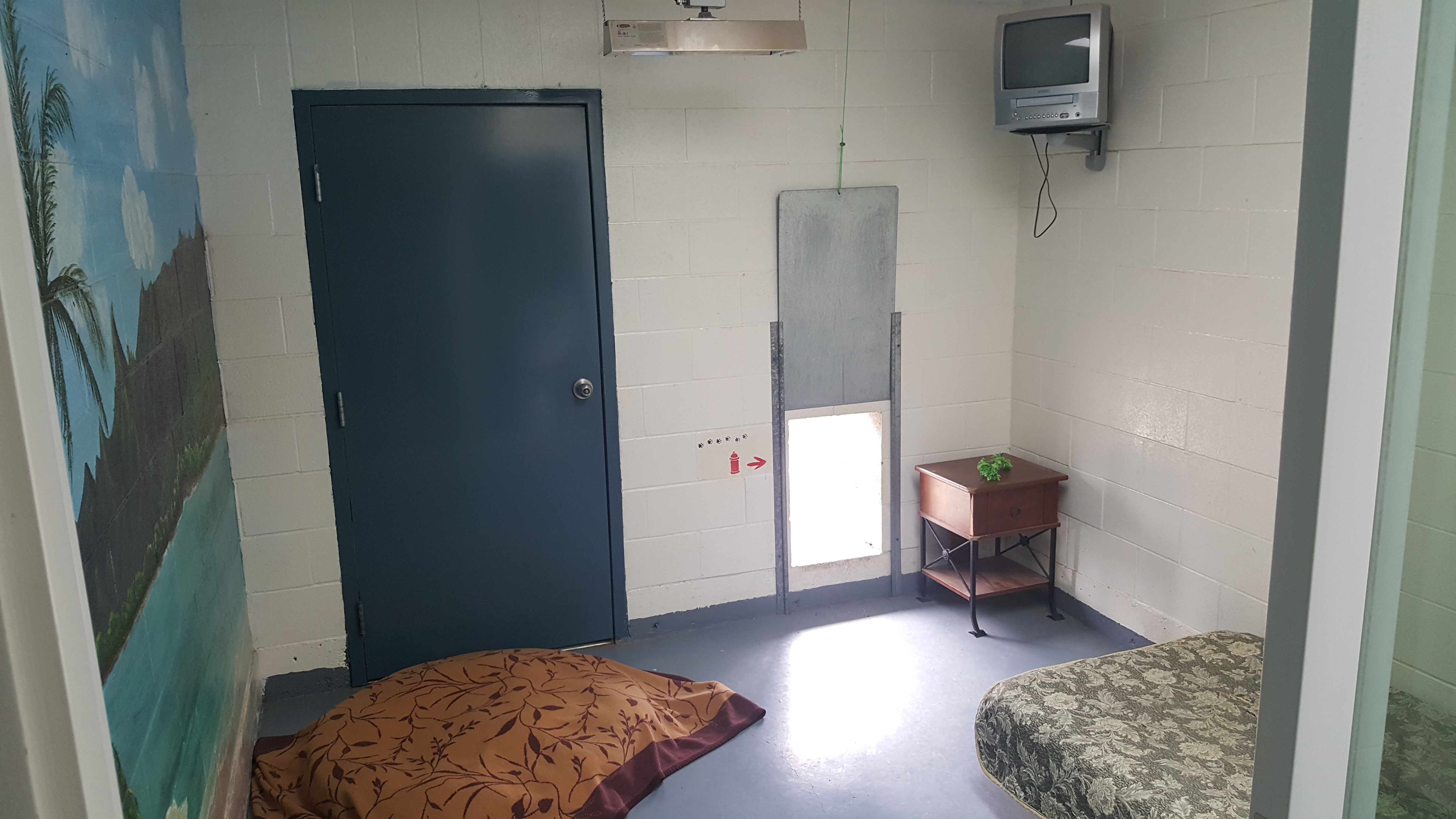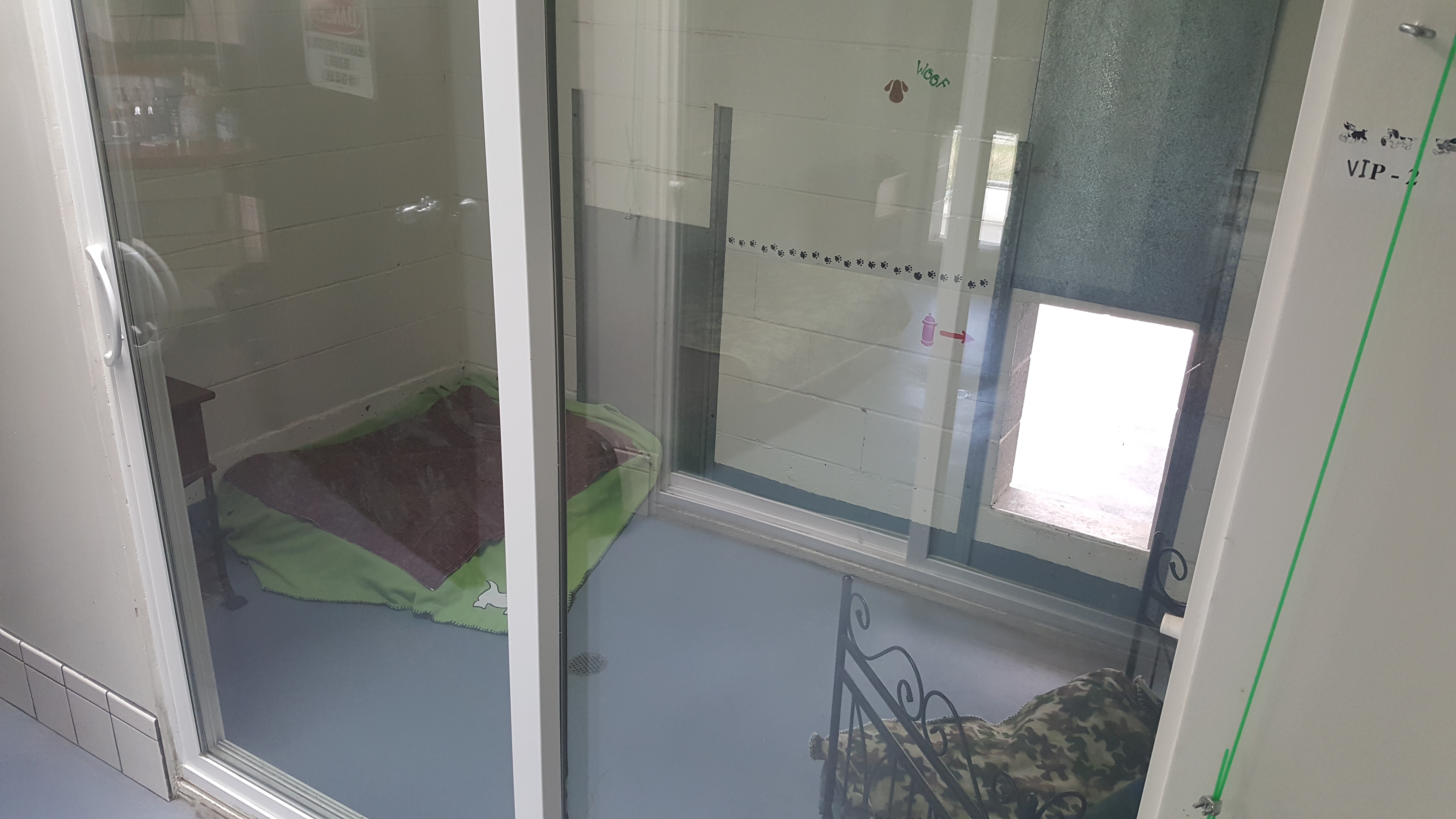 The VIP rooms are larger then our regular runs inside and out. They also have a more at home feel, with beds, blankets, area rugs, side tables, and one room has a TV.